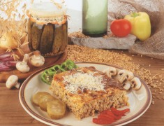 Sušené houby zalijeme teplou vodou a necháme 15-20 minut odstát. Na oleji zpěníme nakrájenou cibuli, přidáme houby, nudličky nakrájené kapusty, osolíme a společně dusíme do měkka. Podle potřeby občas podlijeme vodou nebo vývarem. Přidáme česnek, trochu mletého kmínu, majoránku, bazalku a sůl. Připravenou směs dáme do vymazané zapékací mísy a zalijeme smetanou, ve které jsme rozšlehali vejce a sůl. Navrch poklademe plátky másla a v rozehřáté troubě zapékáme dohněda. Na talíři posypeme strouhaným sýrem a případně polijeme kečupem. Podáváme s čalamádou nebo kyselou okurkou.