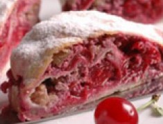 Těsto rozdělíme na 2 části, které na pomoučeném válu tence vyválíme do tvaru obdélníku. Rovnoměrně na něj rozložíme vrstvu umytých, vypeckovaných višní a ořechů, které posypeme cukrem, skořicí a nakrájenými kousky másla.