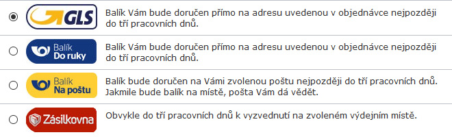 Pokračujte do dalšího kroku "Doprava". Náš e-shop posíla zásilky prostřednictvím České pošty. Při každém druhu balíku je určen přibližný čas dodání a cena, např.