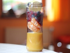 Nejdříve si nachystáme všechny ingredience. Pokud nemáme čerstvé borůvky nebo rybíz tak můžeme použít i zmrazené jak to bylo použito v tomto receptu. Do mixéru si dáme pomerančové juice a postupně přidáváme všechny ingredience a vše důkladně rozmixujeme.